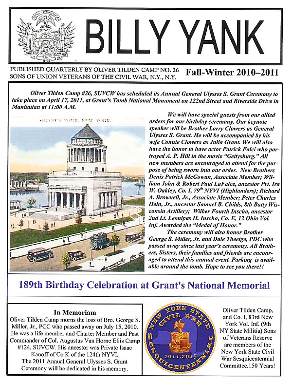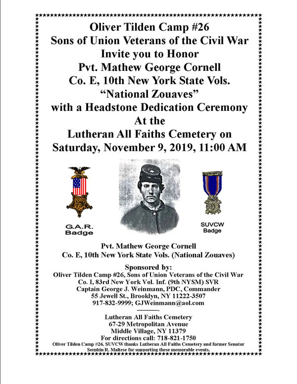 On Saturday, April 17, 2004, Lutheran All Faiths Cemetery, Middle Village, Queens, NY will celebrate their 150th Anniversary. There will be a full day of activities. At one event, Tilden Camp will hold a Headstone Dedication at the J. L. Riker Post 62 plot. Past Commander George J. Weinmann did genealogical research on 57 Civil War Veterans and their spouses that are buried in the GAR plot. PCC Weinmann with the cooperation of Lutheran All Faiths Cemetery, where able to obtain government headstones for their unmarked graves. Oliver Tilden Camp's ceremony will begin at 10:45 AM. Tilden Camp thanks Lutheran All Faiths Cemetery and the Federal Governmant for their help. For more information on the headstone dedication, please contact PCC George J. Weinmann. For more information on the full day of activities, please contact Lutheran All Faiths Cemetery, Middle Village, Queens, NY, 718-821-1750 for directions.